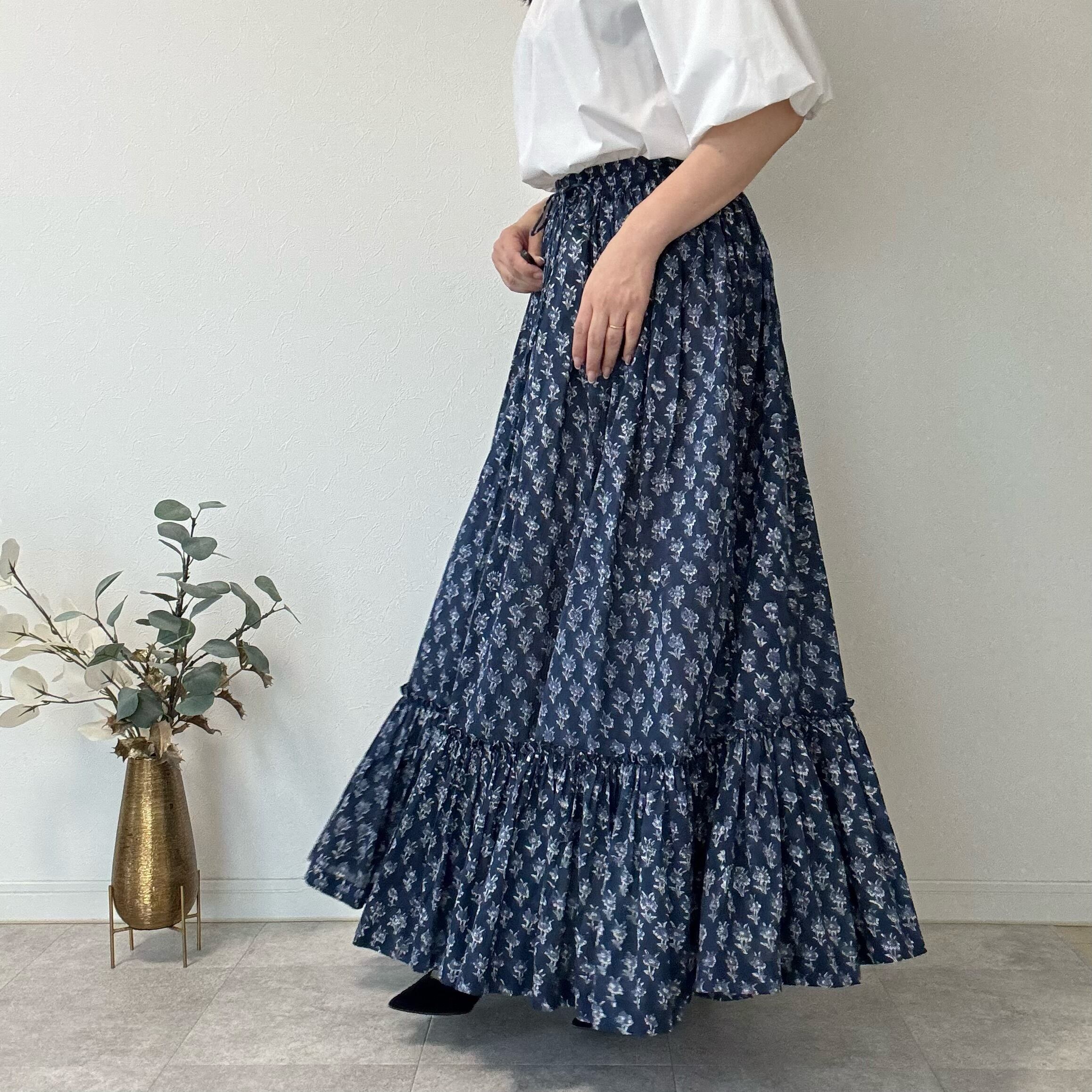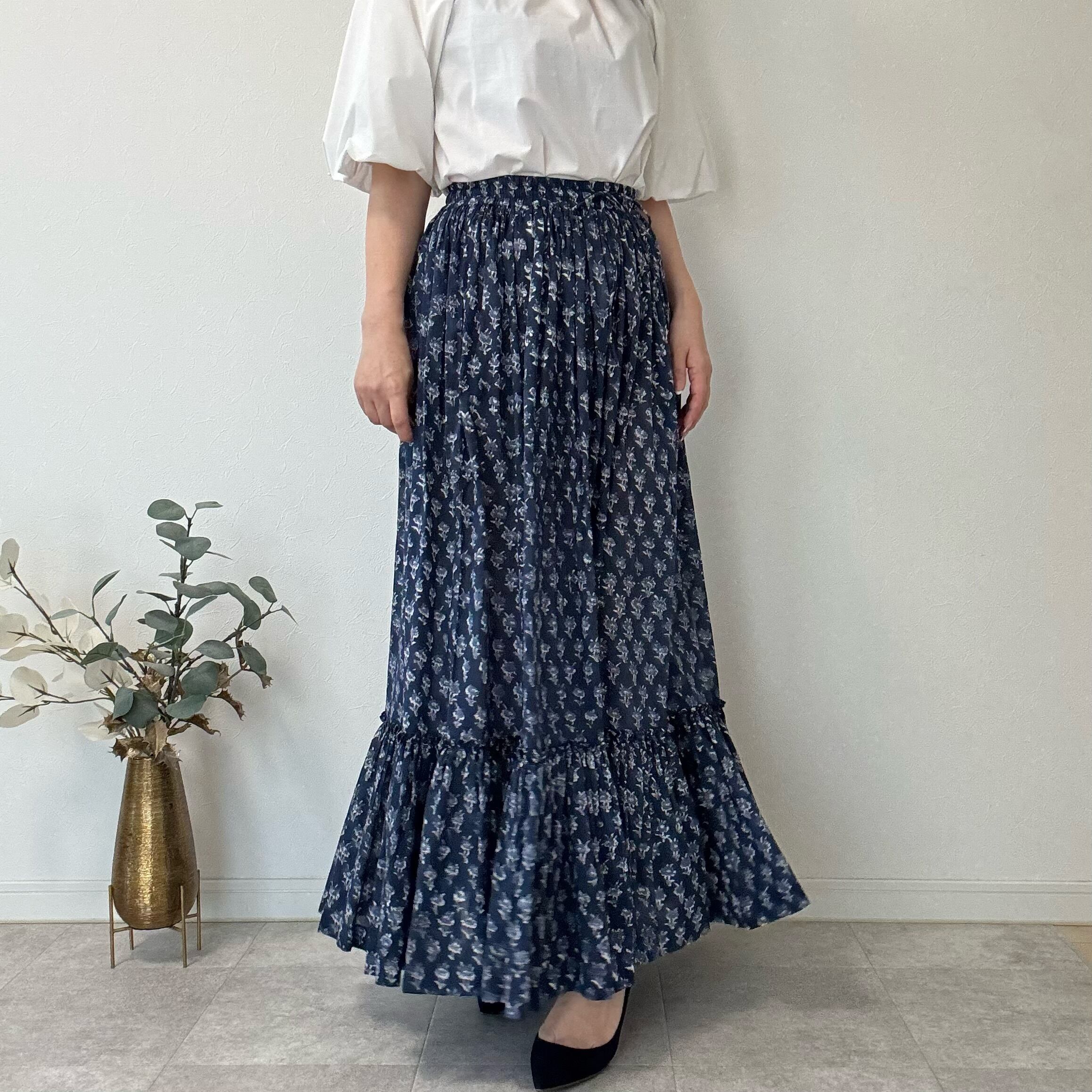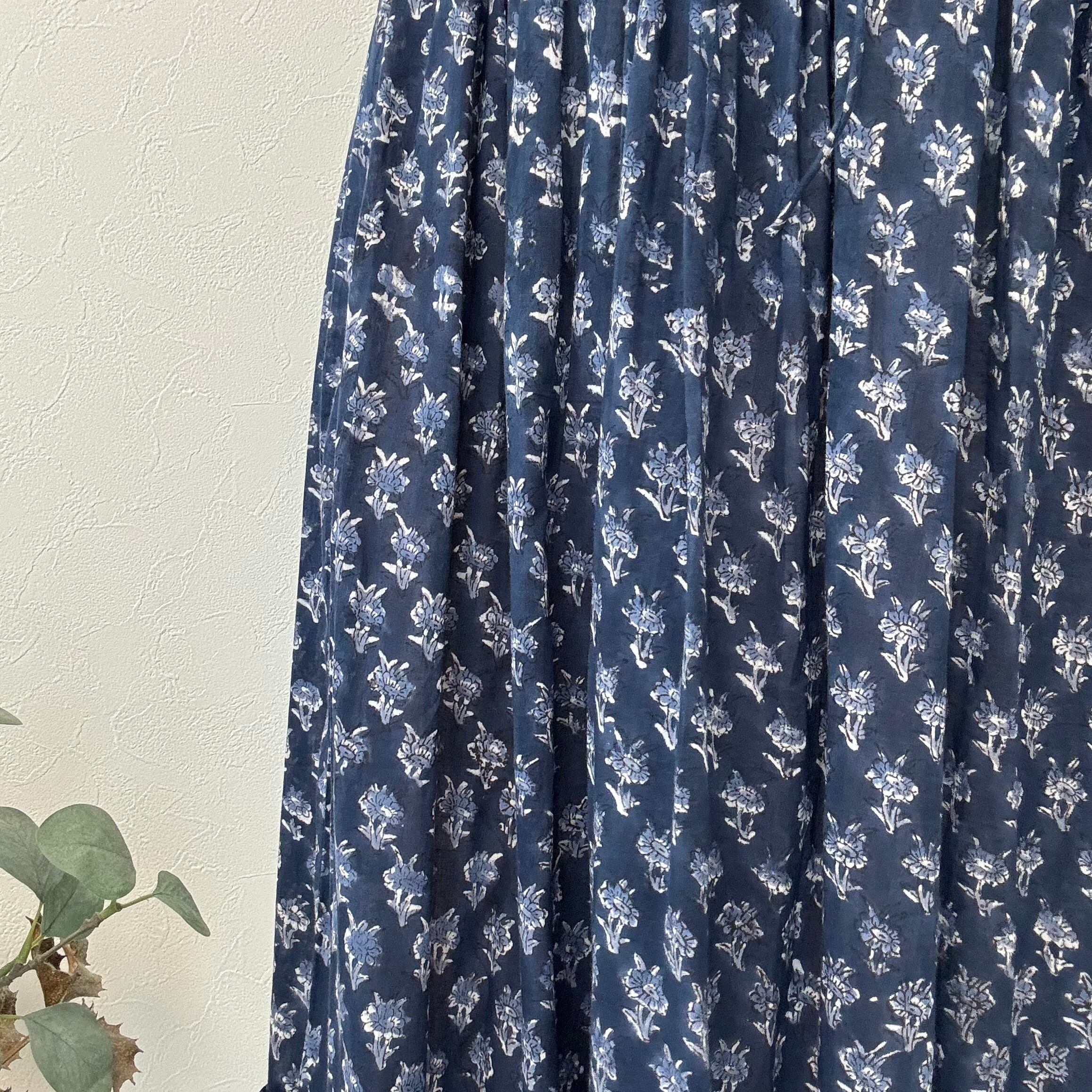 深みのあるネイビーカラーに、細やかな花柄をちりばめたブロックプリントスカート。